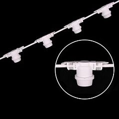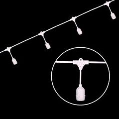 У нас продаются гирлянды стандартной комплектации черного и белого цвета. В наличии изделия, имеющие от 10 до 100 ламп, с расстоянием между светильниками от 0,15 до 1 метра. Каждый патрон имеет кольцо для крепления гирлянды.