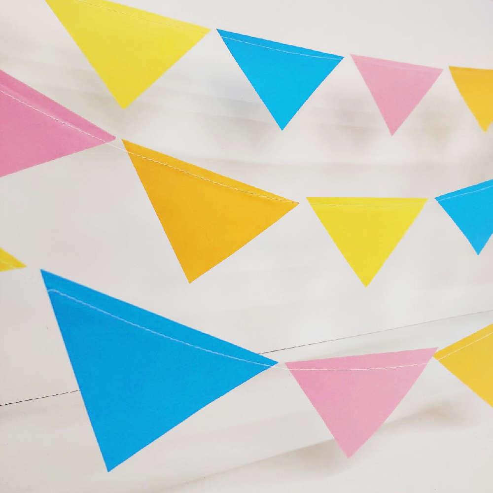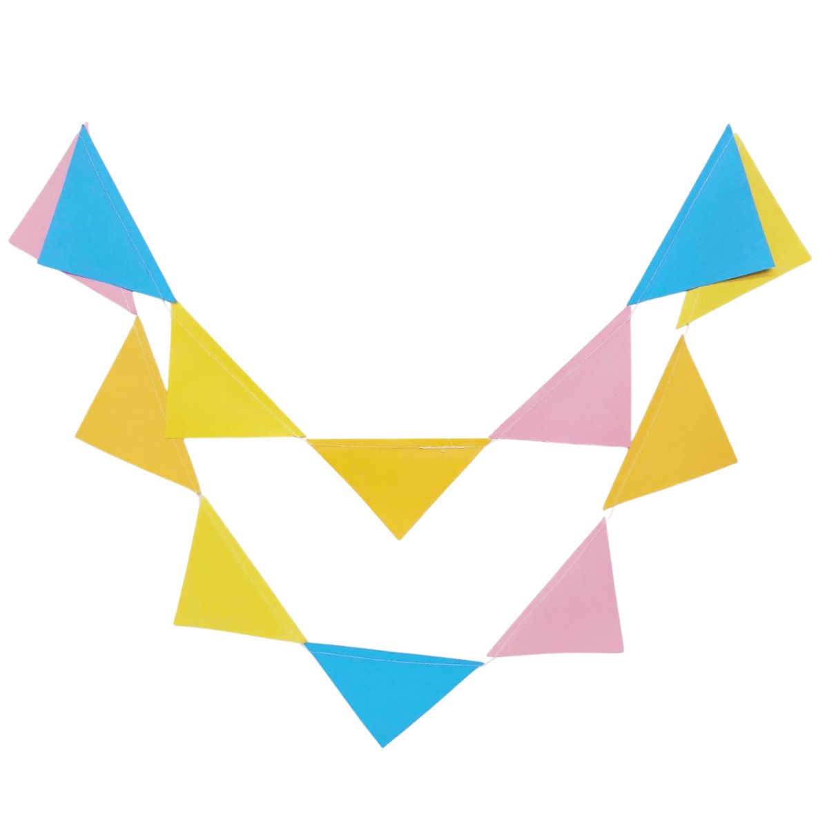 Декоративная гирлянда в форме вымпела, декорированная красочными бумажными двусторонними треугольниками.