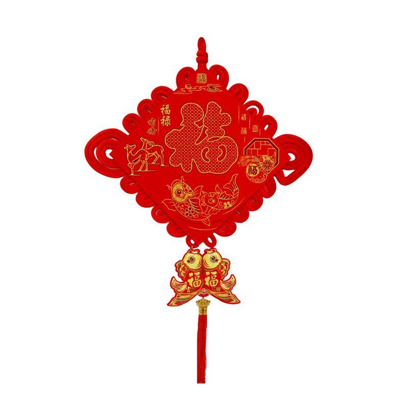 Традиционный китайский узел в форме ромба с символичным дизайном. Яркое сочетание красного бархата и золотых элементов создает эффектный акцент в интерьере.