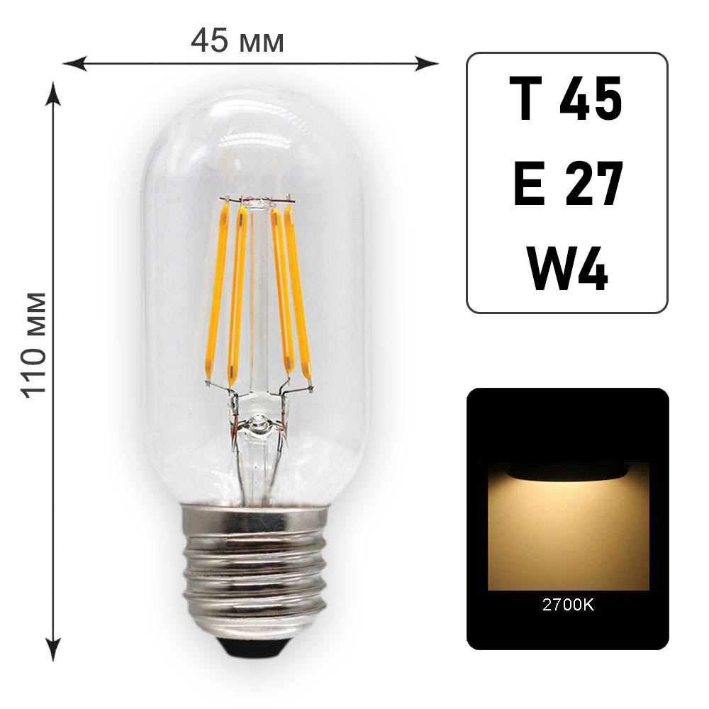 Лампа светодиодная Т45 E27 W4 K2700 – филаментный источник с потребляемой мощностью 4Вт. Тепловой диапазон испускаемого света 2700К. Гарантия от производителя – 20 000 часов.