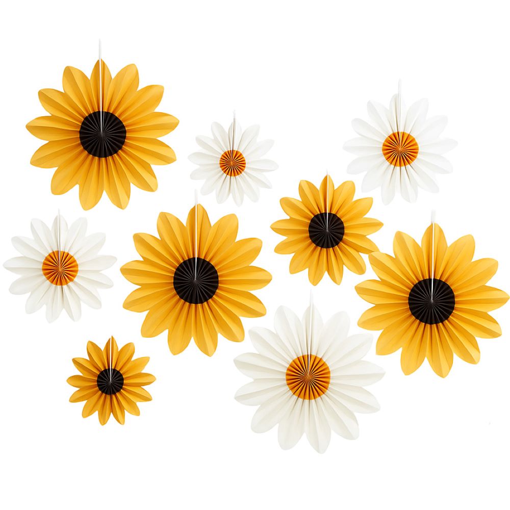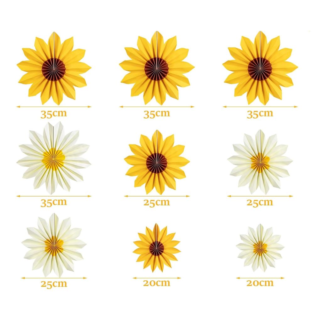 Яркий декоративный набор фантов в форме подсолнечников станет солнечным акцентом любого праздника, фотозоны или витрины. Бумажные цветы разных размеров создают эффект живой композиции, добавляя тепла и уюта в оформление.