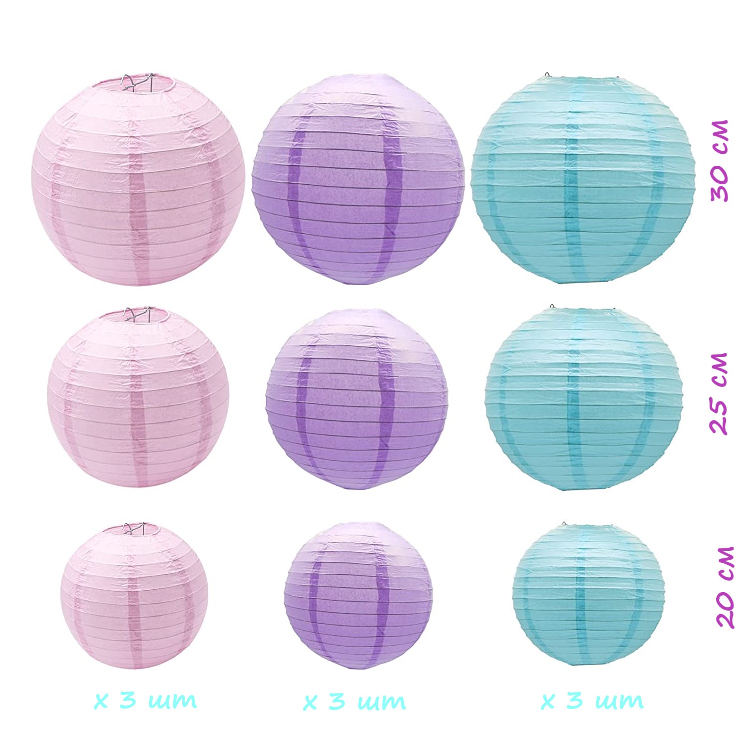 Набор подвесные фонарики 9 шт, розовый+св.сиреневый+голубой