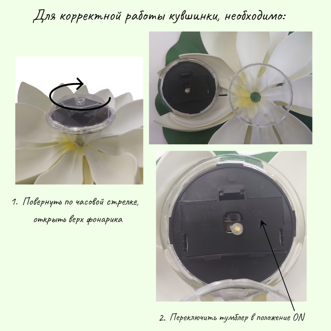 Внимание!Светильник может прийти с разряженной батареей. Перед включением подержите его под солнечными лучами. Для включения светильника нужно повернуть на пол оборота верхнюю часть цветка и переключить в положение ON.