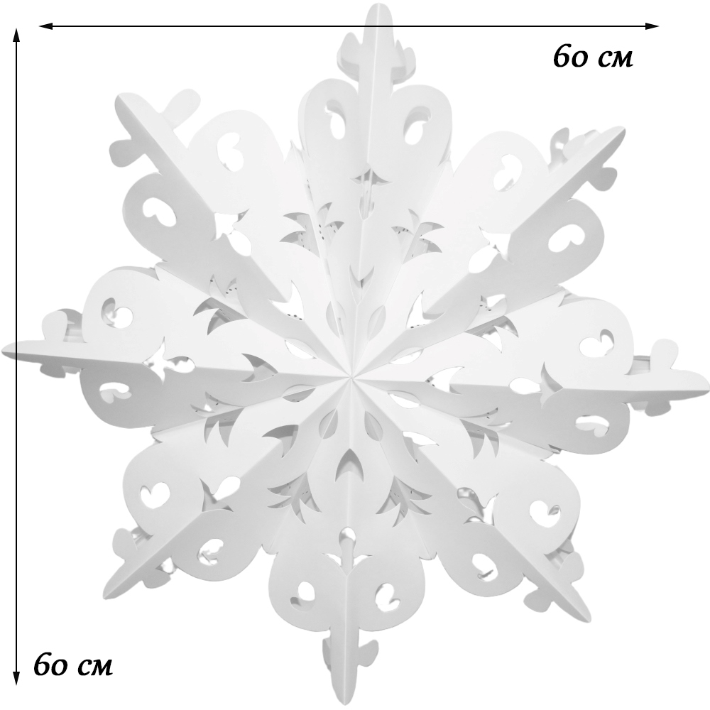 Снежинка на липучках размером 60 см, белого цвета, изготовлена из высококачественной бумаги.
