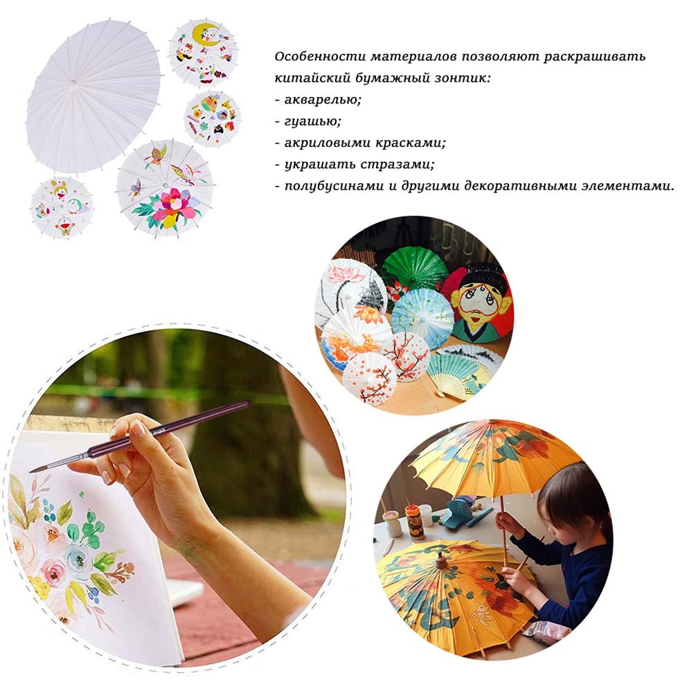 Раскрашенный и украшенный зонт китайский бумажный подходит для создания фотозоны, свадебного оформления, дополнения тортов. Также декоративный зонтик используют в качестве аксессуара для самодельных кукол и создания театральных декораций.