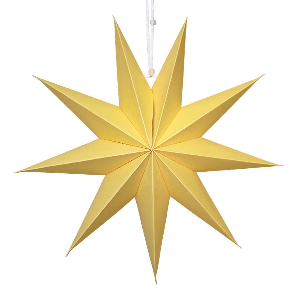 Объёмная декоративная звезда из картона диаметром 30 см с 9 лучами. Оснащена встроенным шнурком для подвешивания. Поставляется в компактном сложенном виде и быстро собирается: специальный шнурок при затягивании придаёт изделию объём и фиксирует форму. После сборки звезда остаётся устойчивой без дополнительных креплений и может использоваться многократно.
