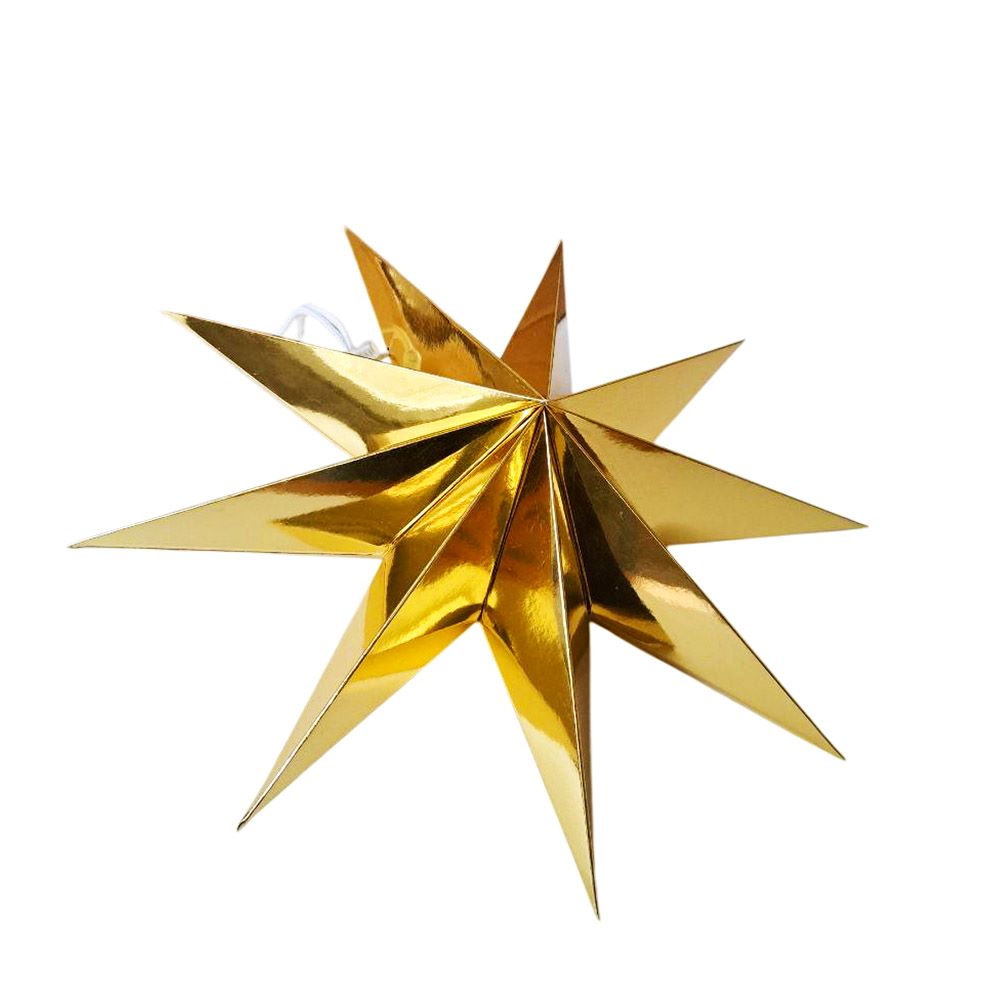 Объёмная декоративная звезда из картона диаметром 30 см с 9 лучами. Оснащена встроенным шнурком для подвешивания. Поставляется в компактном сложенном виде и быстро собирается: специальный шнурок при затягивании придаёт изделию объём и фиксирует форму. После сборки звезда остаётся устойчивой без дополнительных креплений и может использоваться многократно.