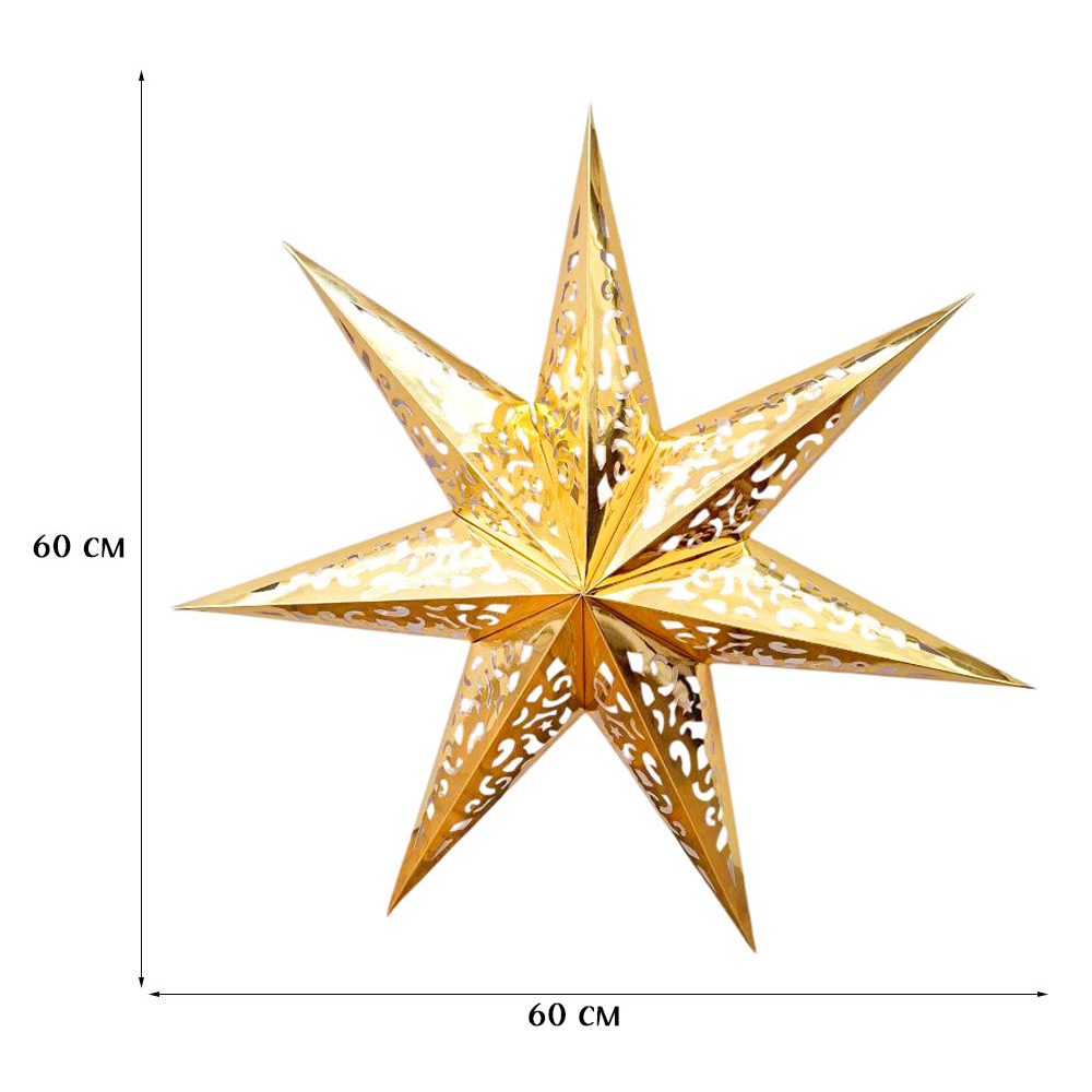Семиконечная объемная звезда 60 см — великолепный декор из тонкого перфорированного картона. Создает красивые световые эффекты. Поставляется в сложенном виде, в комплекте шнур для фиксации объема и подвеса.